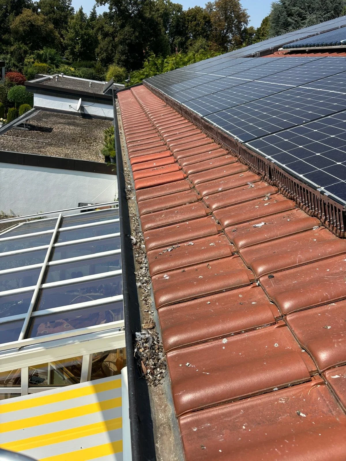 Taubenkot ist stark säurehaltig und kann Fassaden, Dächer und Metalloberflächen dauerhaft beschädigen, Regenrinnen mit Nestmaterial verstopfen und teure Reinigungen erforderlich machen.